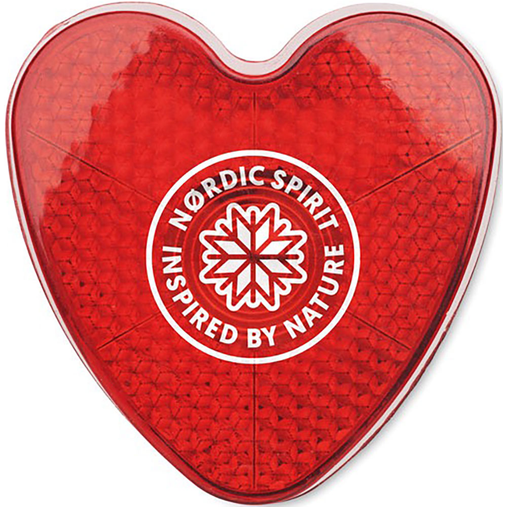 Hjärtformad röd reflexlampa i ABS med klämma på baksidan. Kan användas med fast eller blinkande lampa.Inklusive 2 utbytbara LR44-batterier.