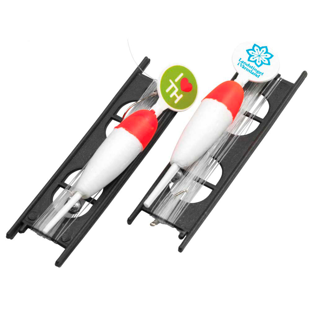 Här får du ett mete-set med lina, krok, flöte och sänke plus ditt eget tryck på den runda eller fyrkantiga toppen på flötet.