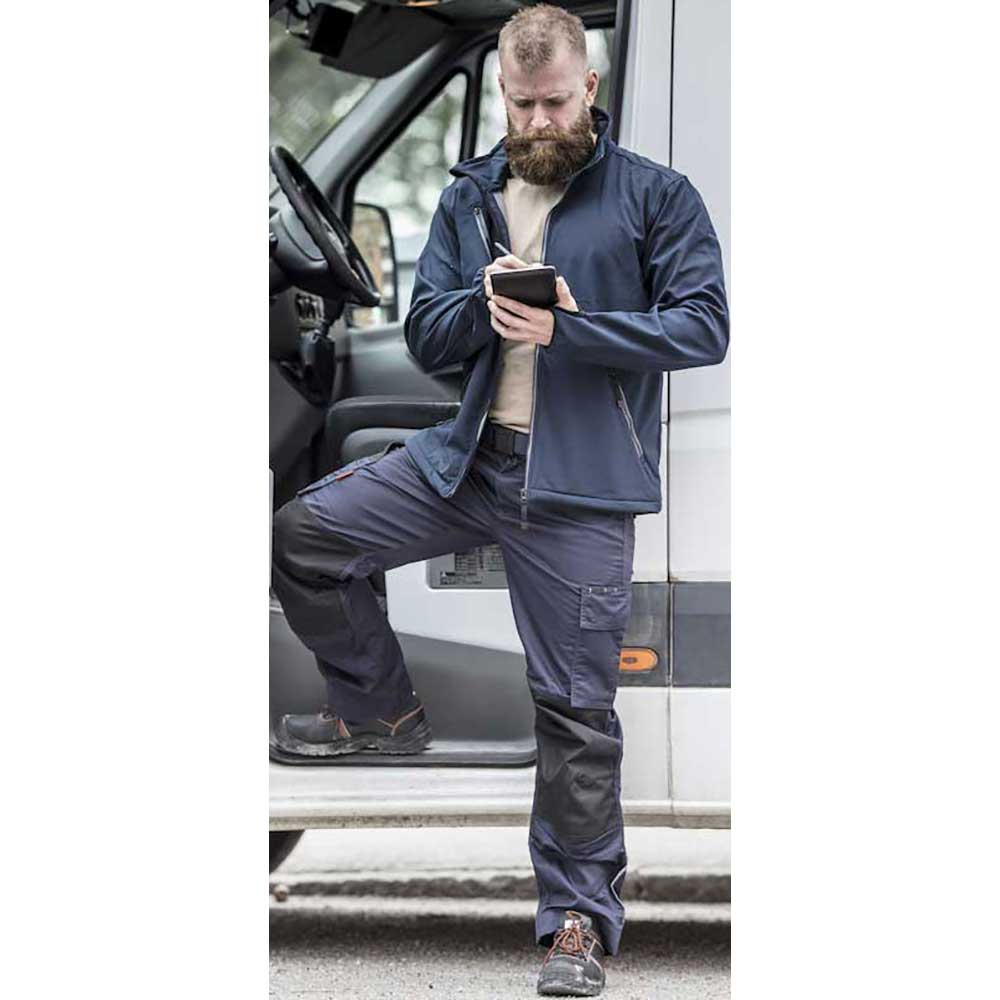 Bakfickor med lock och kardborrestängning. Benficka med extrafack och lock med kardborrestängning. Tumstocksficka med knivhållare. Förstärkning på knäskyddsfickor.