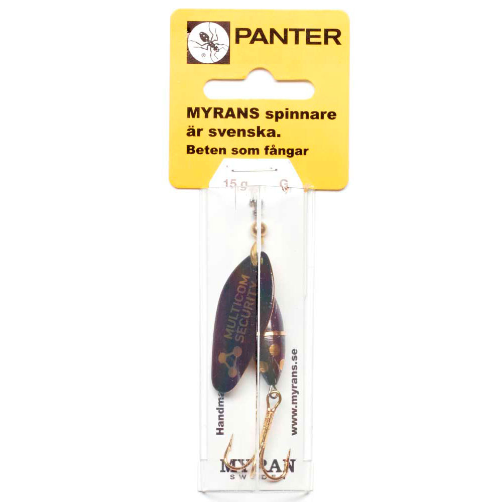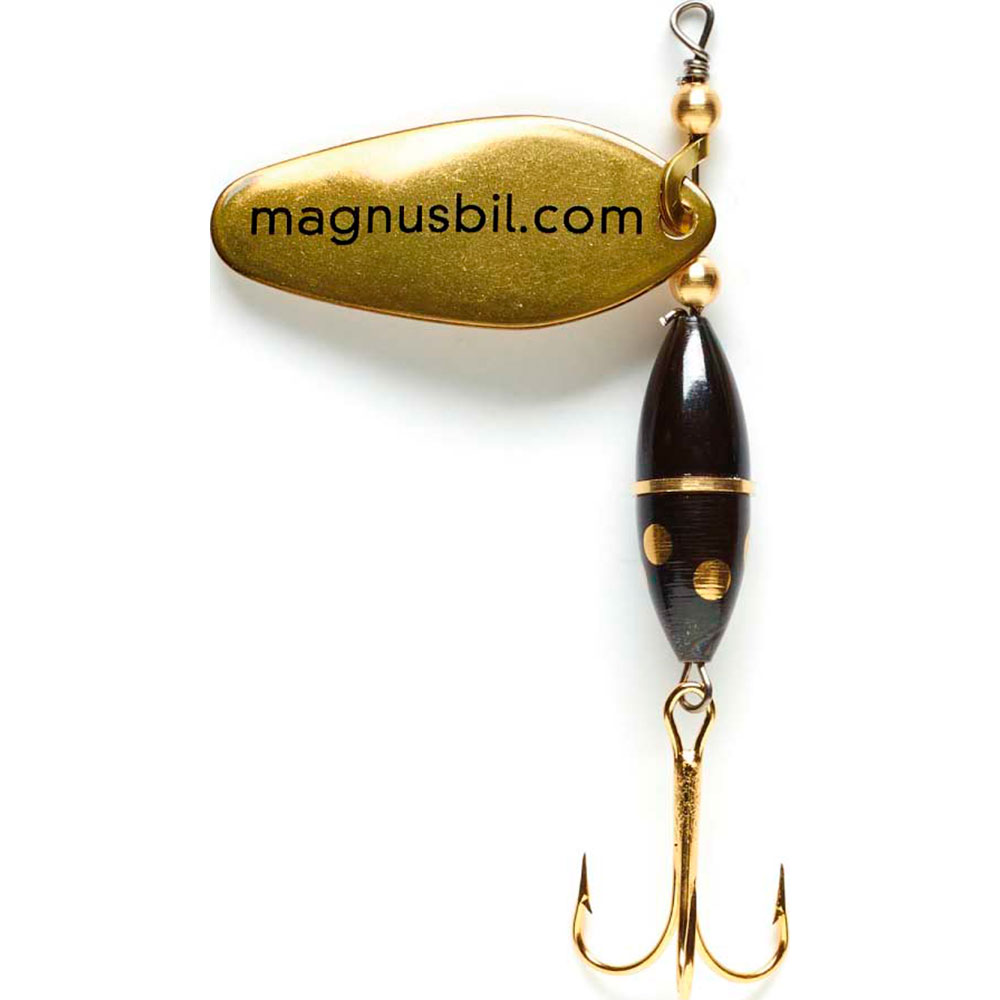 Kompakt och lättkastad spinnare, 15 g, för harr, öring, röding och lax med Myrans unika bygel. Svart överdel och guldprickig underdel samt guldkrok.