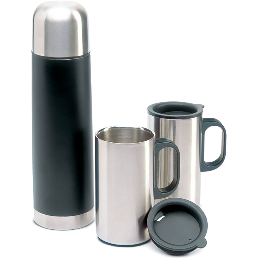 Set med Termosflaska och 2 st ”ToGo” muggar i rostfritt stål med vakuumisolering. Flaskan rymmer 500 ml och muggarna 220 ml. Levereras i fin presentask i kraftig kartong.